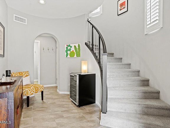 Beautifully appointed with a neutral color palette, this charming end unit has no neighbors above or below. The sophisticated floor plan offers a generous entry way, spacious spiral stairs, open great room living, and 2 bedrooms, both with ensuite bathrooms. The kitchen offers quartz counters, a tiled backsplash, island with breakfast bar & pendant lighting, and stainless steel appliances. Additional upgrades include custom shutters, quartz counters in bathrooms and laundry room, custom tiled showers, porcelain tile flooring, and a laundry room sink. The Villages at Aviano is gated and offers a heated community pool, covered gathering area, fireplace & BBQ area. Additionally, Aviano Community Center - just a 1/4 mile walk from this unit - offers a 15,000 sq. ft. clubhouse with fitness center exercise classes, resort pool, spa, tennis and basketball courts, 10-acre park and playground. Easy access to the 101 and 51 freeways. Minutes from Desert Ridge Marketplace, High Street, and Mayo Clinic's Phoenix campus.