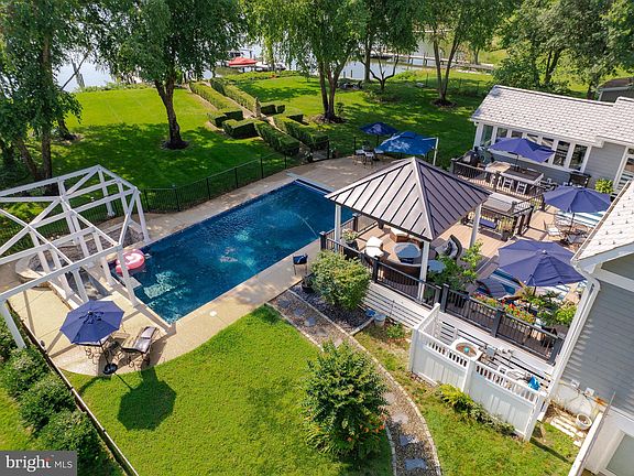 A rare offering on Island Creek, this beautifully reimagined waterfront estate blends timeless architecture with refined updates and resort-caliber amenities. Encompassing approximately 1.4 acres with 102 feet of deep water frontage (4–5 ft MLW), this residence offers an unparalleled lifestyle of elegance and leisure. A sweeping circular drive leads past a decorative front koi pond to the gracious façade clad in HardiePlank siding (2020) beneath a synthetic slate roof (2020). Inside, expansive living spaces showcase soaring Palladian windows that capture panoramic water views, refinished hardwood floors, and a main-level primary suite with deck access. The gourmet kitchen has been enhanced with granite counters (2022), refinished cabinetry and hardware, and flows seamlessly to the sunroom and spacious gathering areas. The upper level offers four generously sized bedrooms, while the finished lower level includes a theater, gym, recreation room, wine cellar, and flexible bonus space. A walk-up attic with a rough-in invites future expansion if desired. Outdoors, enjoy a sparkling gunite in-ground pool with an auto cover (2020) that naturally warms the water, plus a cooler heat pump for when it gets too warm. Entertain under the covered cabana (2022), on the expansive composite decking, and across manicured grounds with an in-ground sprinkler system (2024). The private pier is fully equipped with a boat lift and additional pilings that can accommodate a larger vessel. Meticulously maintained and thoughtfully improved, additional upgrades include a new front door (2022), upgraded garage doors (2020), comprehensive interior painting, a security system (2025), and more.
