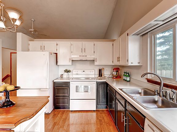 Stunning D20 Rancher with remarkable Pikes Peak and mountain views from new composite deck. Vaulted ceilings and open floor plan greet you as you cross the threshold of the covered front porch. The low maintenance flooring flows easily from the Entry Way and Living Room into the huge country kitchen with plenty of space for a large table. The main level features three spacious bedrooms including the Master Bedroom and downstairs are another two bedrooms, including one that is so large, it could easily be a Jr. Suite. The large master suite includes a bathroom that has been completely remodeled and features solid surface counters, double sink, and a spa-like shower space. The secondary bathroom upstairs has also been remodeled with solid surface counters and terrific designer touches. Outside you will find a large, fully fenced yard with great privacy, mature trees, and multiple entertainment spaces. Brand new paint. New composite deck. VIEWS that can't be beat!
