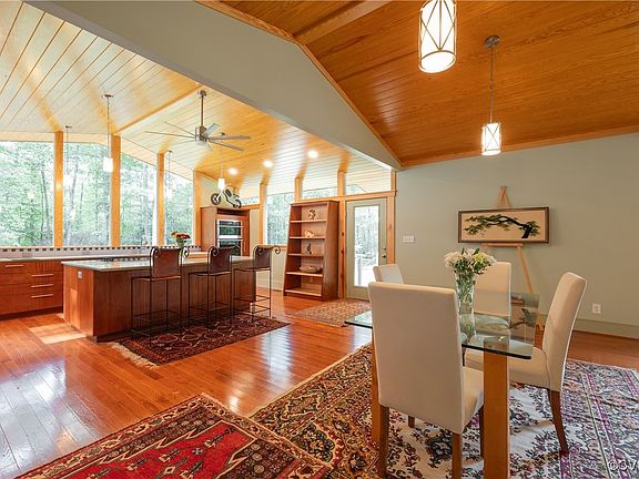 Maidens Forest is a one-of-a-kind unique house built with upscale craftsmanship and quality lumber and trim. Located deep in a natural forest you are surrounded by 360 woods and blue skies. Enter through a quaint foyer and step into a cavernous light filled living room while looking out at the woods and the yard beyond. So much to take in: cathedral ceilings and windows, an expanse of wood flooring and gorgeous trim work. The kitchen has custom mahogany cabinetry- including a fabulous built-in pantry, a generous sized island and double ovens. Adjacent to the kitchen there is ample space for a formal dining area, and you will love the light filled living room. From the main level the floor plan allows you to go downstairs to a family room, 2 spacious bedrooms- each with a private bath and your laundry room or you can journey upstairs to another bedroom and the primary suite. The upper level also has a cozy reading nook/office area, and a gorgeous primary bathroom with a walk-in shower and soaking tub. All bedrooms have walk in closets and private baths and all of the rear facing rooms have corner windows. Outside you will love to relax on one of the 3 different seating areas overlooking the woods on your 3.38 acre lot. This is truly a unique home and a beautiful property. Seller is a builder and is willing to build a 2 car garage at a reasonable price. Welcome to Maidens Forrest.