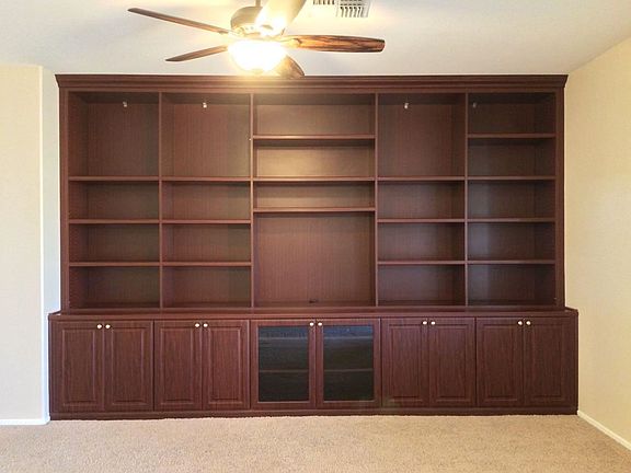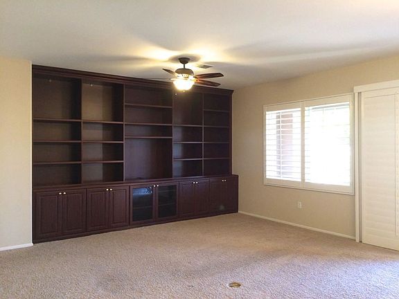 Sun City Palm Desert 55+ community - This popular 3 Bedroom, 2 Bath St. Croix floor plan includes an extra hobby room. The large Great room has a custom built-in media center and opens out to an east facing back yard with an extended patio. The open kitchen features a convenient island, breakfast bar, stainless appliances, gas range, Corian countertops, pull-out cabinet drawers, and a bay window in the dining nook. The spacious Master suite has a large walk-in closet with built-in storage. The Master bath has a double vanity with pull-out cabinet drawers. The inside laundry room has a washer, gas dryer and cabinets. The Great room, bedrooms and hobby room are carpeted, and the kitchen, bathrooms, and laundry room have travertine tile floors. There are plantation shutters and ceiling fans throughout. The windows have been tinted for energy efficiency. The 2 car plus golf cart garage has built-in storage cabinets. An internet and cable TV package is also included. Available unfurnished. No smoking. No pets. Enjoy the Sun City Palm Desert lifestyle in this exceptional home!