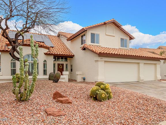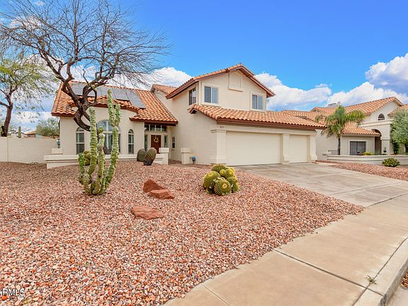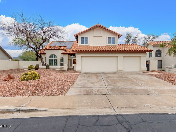 Wow!! Gorgeous 5 bed, 3.5 bath energy-efficient home in Red Mountain Ranch! Displaying a desert front yard and a 3-car garage w/extended driveway. Discover a welcoming foyer, spacious living & dining room, vaulted ceilings, neutral paint, carpet & wood-look flooring t/out, charming light fixtures, sliding doors to the back, bay windows in all the right places, plantation shutters, and tons of natural light. The family room opens to the kitchen, boasting a fireplace for chilly nights! You'll love the kitchen offering SS appliances, granite counters, ample cabinetry, subway tile backsplash, a breakfast bar, and a cozy nook. Head upstairs to find the main bedroom featuring a barn door that opens to the ensuite with a bay window seat, travertine step-in shower, dual sinks, & a walk-in closet. Secondary bedroom downstairs, with access to the back, can also be an office. Laundry room with built-in shelves & cabinetry for added convenience. Enjoy the large backyard, ideal for relaxing & entertaining! Flagstone-covered patio, lush lawn, mature trees, and a fenced sparkling pool & spa complete the picture. NO neighbors behind!! This gem backs up to a common area adjacent to the Red Mountain Ranch Pete Dye designed golf course. Easy access to Red Mountain 202 Freeway and close to Tonto National Forest with mountain biking, hiking trails, lakes, & rivers. Welcome to this fantastic property with everything you need! Truly a MUST-SEE!