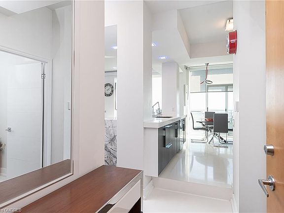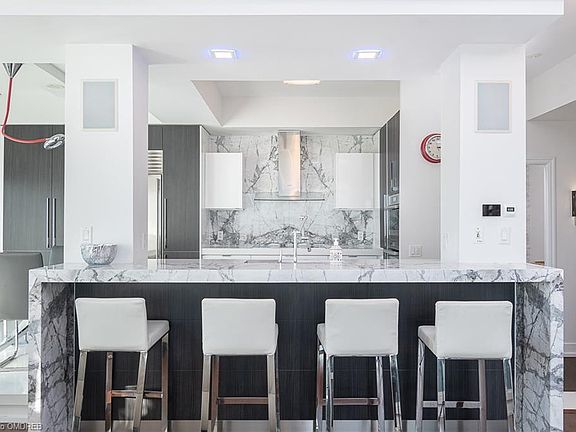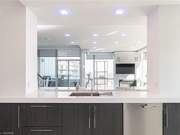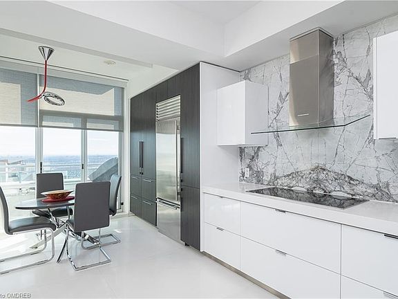 Experience luxury in this stunning 2 bedroom 2 story penthouse suite. Surrounded by amazing amenities (Japanese garden, shopping, library, transportation, Sheridan Campus and more!) Great access to major highways 403/427/QEW. Open concept living with floor to ceiling windows giving you panoramic breathtaking views of the city and lake. BONUS: two balconies. Full of upgrades - drop down crown, pot lights with LED colours, power blinds, built-in speakers (incl. receiver), engineered hardwood, OVE toilet, engineered hardwood flooring & so much more! Sleek modern kitchen with high end stainless steel appliances [Miele & Sub Zero], quartz counter tops, huge eat-in bar, plenty of storage & more. Head to the second floor to the 2 oversized bedrooms with their own private ensuite, convenient 2nd floor laundry and computer nook - ideal for working from home. Everywhere you look is a beautiful view. Don't miss out on your chance to be in the best spot in the neighbourhood!