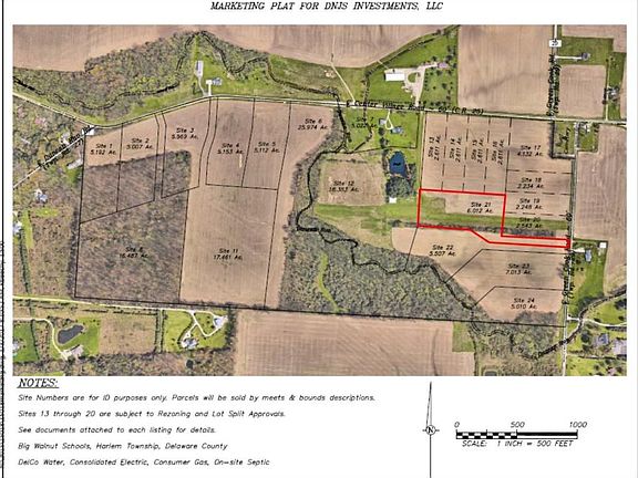 REFER TO AS SITE #21. SPECTACULAR RURAL BUILDING SITE, FLAG LOT, MOSTLY OPEN WITH SOME TREES. NO DEED RESTRICTIONS. DELCO WATER, BIG WALNUT SCHOOLS, GAS AVAILABLE SOON (SEE INFO IN DOCUMENTS). 30 MINUTES TO DOWNTOWN, 11 MINUTES TO NEW ALBANY, 11 MINUTES TO SUNBURY. SURVEY AND LEGAL ARE ATTACHED IN DOCUMENTS. ONE OF THE OWNER PARTNERS IS ALSO THE LISTING AGENT.