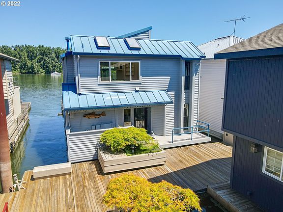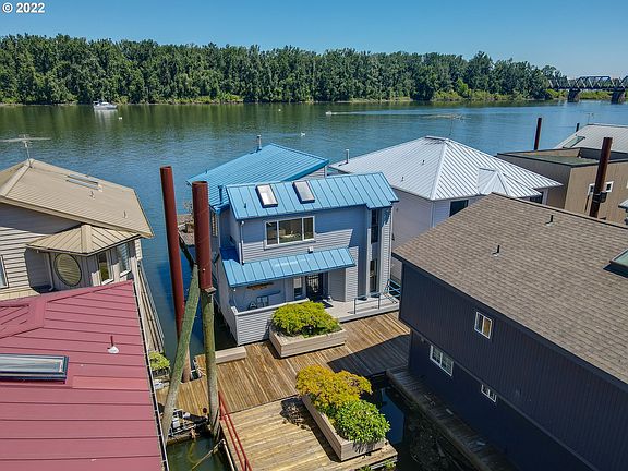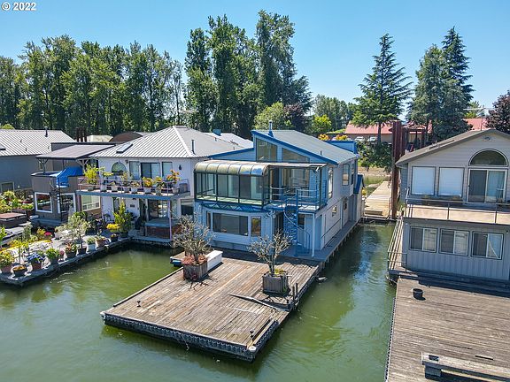 Enjoy panoramic views of the Columbia River at this floating home across from the undeveloped part of HaydenIsland. The HOA recently voted to allow dogs as pets! The home comes with slip ownership and ownership of a1-car garage at the listing price. An additional garage is available at a price of $35,000. Soaring ceilings and a wall of windows bathe the great room and adjoining kitchen with light. The open floor plan upstairs with an inviting sunroom and deck make the upper level living area ideal for year-round enjoyment. The kitchen has an oversizedwalk-in pantry, an island, and a double oven. The primary suite has a walk-in closet, gas fireplace, and slidingglass door to the huge deck with views up and down the river. There is abundant storage and room to keep aboat.