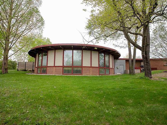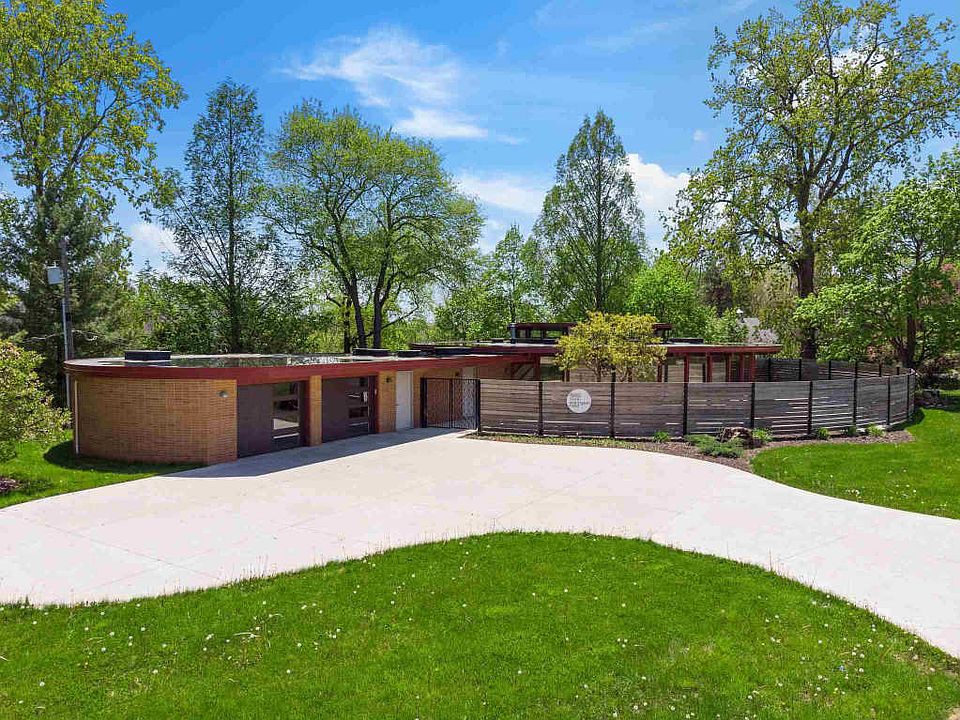 This unique, round, mid-century modern home was inspired by Frank Lloyd Wright and designed by Orus Eash. The cedar, domed cylinder ceiling is the basis for the remaining rooms to the home. After entering a contemporary double-iron gate, the large outdoor patio spans the entire front facing of the home and has a decorative fence for privacy. Inside, the living room and dining room are open and have an entire all of windows, looking out to the patio. The kitchen has a large opening - connecting it to the main living areas, custom metal cabinets, solid stone counter tops and stainless appliances. The master suite is spacious, again with an exterior wall of windows with privacy blinds, custom cabinets and closets and a private bath with a walk-in tiled shower. The other 3 bedrooms follow suite with large windows, custom blinds and unique closets. The finished basement has a large area for entertaining, with a large game room area plumbed for a wet bar and private den (or guest room). This home has several skylights, 2.5 more baths, several doors leading outside, 2 AC units and 2 water heaters. This home is truly a one of a kind home in many ways and a 'must see'!