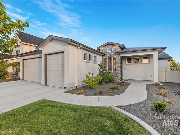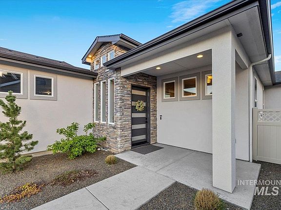 Nestled in the prestigious Bridgetower West subdivision, this stunning 4-bedroom, 2-bathroom with a designated office offers an unparalleled blend of comfort and sophistication. With a spacious 5-car garage providing ample parking and storage space. Step inside to discover luxury tile flooring throughout the home, complemented by airy 10-foot ceilings. The living room features a custom-built entertainment center with an electric fireplace. Enjoy the convenience of remote-operated luxury blinds in the living room, ensuring privacy and comfort at all times The heart of the home is the gourmet kitchen, complete with luxury height counters, a coffee bar, and a wine and liquor bar, ideal for entertaining guests or indulging in culinary delights. Retreat to the private backyard oasis, where you'll find tranquility and seclusion with no rear neighbors EVER, an expansive patio for outdoor gatherings, as well as unobstructed views of the Owyhee's! Built by the exclusive and sought after Ninety Degree Construction.