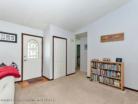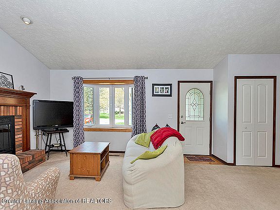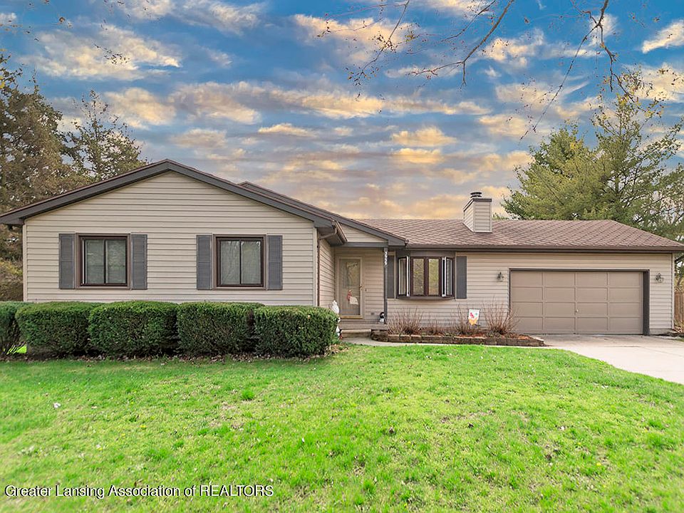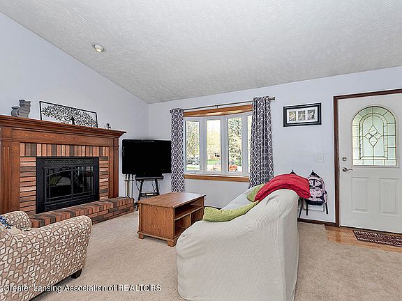 This beautiful ranch home sits on almost a half of an acre of land and is located within the desirable Holt/Dimondale school district. Backing up to the well-established Hearthside neighborhood, you will notice the wonderful curb appeal as you pull up to your new home. Enter into the spacious living room and take note of the large Bay window that floods the space with natural light, neutral decor and the stylish wood-burning fireplace with brick surround. In true open-concept fashion, the living room leads to the dining room and kitchen. The dining room has access to the 2 car, attached garage, finished basement and a sliding door that leads to the large, multi-tiered deck overlooking the fabulous back yard.