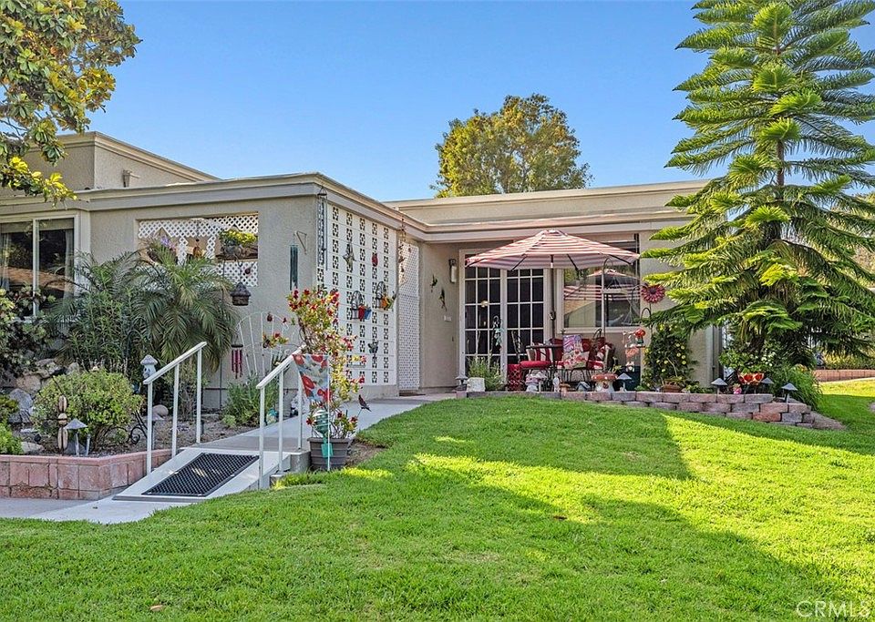 ONE OF THE “BEST” OPEN-VIEW LOCATIONS IN LAGUNA WOODS VILLAGE GATE 1. FANTASTIC OPEN VIEW WITH SADDLEBACK MOUNTAIN IN THE DISTANCE! BEAUTIFUL OUTLOOK FROM EVERY WINDOW. Enjoy the extended tiled patio off the front door, bringing the outdoors in. INCREDIBLE CURB APPEAL! You won’t want to miss seeing this home! It's single-level with no one above or below and no steps—double-door entry with beautiful laminate wood flooring throughout and double-pane windows with retractable screens. Enjoy the open remodeled kitchen with recess lighting, lots of storage, a microwave, a dishwasher, a nice 2-door refrigerator, granite countertops, a stone tile backsplash, and a window above the kitchen sink. The remodeled bathroom has a large walk-in shower, marble counters, and lots of storage. Additional features include Split A/C units in the Living Room and Master Bedroom, Double Pane Windows, Plantation Shutters, Crown Molding, Upgraded Baseboards, Smooth Ceilings, and a dedicated closet for the Washer/Dryer are just a few of the remodeled features in this lovely home. In addition, Venetian plaster on the living room wall and hallway. NO STAIRS and parking is close. This particular home is convenient to gates 1, 2, and 3. GREAT CENTRAL LOCATION! An excellent addition to this home is an atrium off the dining area, a lovely outdoor area, and a nice-sized private patio in front. The avid gardener can create a beautiful green oasis outside the front door. This home is in a very private, beautiful, and peaceful location. Add all this to the amenities offered by Laguna Woods Village. You have a winning combination of a 27-hole championship golf course or the 9-hole executive par 3 courses, tennis, paddle tennis, lawn bowling, 2 fitness centers, 7 clubhouses, 5 swimming pools, an equestrian center, gardening opportunities, an art studio, world-class woodshop, over 200 clubs and organizations ensure you will never get bored here! Plus, free bus transportation around the community and nearby shopping and bus trips. Also, there is a very economical RV storage area in which to park your RV. Country Club Living is at its BEST and approximately 6 miles from beautiful Laguna Beach! There is something for everyone. *SEE VIRTUAL TOUR* (CARPORT#305 SPACE 10)