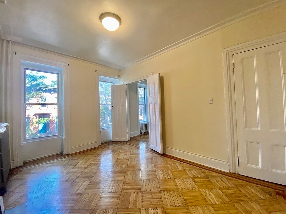 2nd floor of 3 floor brownstone in good shape with old details intact. Eat-in kitchen, north and south light. Four rooms in a row but with a hallway, and a small room off the big room in front, nice for work from home or small bedroom. Multiple entrances; good for shares, ideal for a couple. Freshly painted and sanded/coated floors; brand new stove. Between 4th and 5th Avenues and Flatbush Avenue, so many bars, restaurants, laundromats, and misc. stores right nearby. Landlords also live nearby.