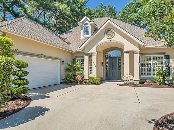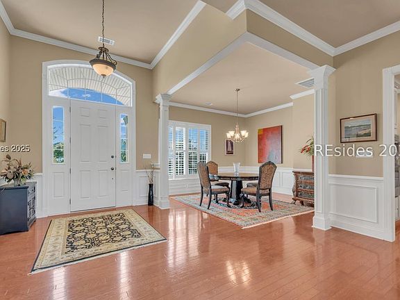 This Riverwalk floorplan shows like a model and is move in ready. 3 bedrooms/3.5 bathrooms loaded with extras: kitchen with granite counters, SS appliances, pull-outs, over/under counter lighting, tile backsplash, pendant lighting over bar seating, and built in oven/microwave. Primary suite has a large bedroom, bath with separate shower and extra large walk in closet. Great separation of bedrooms. Both guest rooms are ensuite. Wood flooring in all main living areas, carpet in bedrooms, plantation shutters throughout. Crown molding in all living areas plus primary bedroom. Oversized garage with utility sink allows for 2 cars + a golf cart. Pulldown stairs in garage with partially floored storage above. Premium lot with extra spacious back yard overlooking the lagoon. Riverton Pointe is a staff gated new-home community that offers an array of amenities including a Jack Nicklaus Design golf course, driving range, pro shop, restaurant, swimming pool, tennis, fitness center, future clubhouse, pickle ball, bocce ball, social events and much more!. Hampton Pointe within 20 minutes of Savannah, GA, Beaufort SC and the beaches of Hilton Head Island.