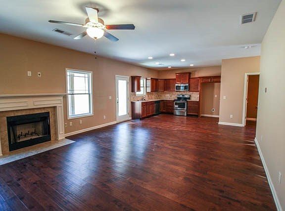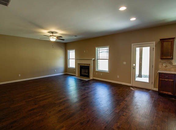 Elegant new home with all bedrooms on second floor for privacy. Owner suite is spacious and offers his / hers walk in closets. Double vanity, garden tub, separate shower. Main living area is open concept and family friendly, with fireplace and ceiling fan in family room. Kitchen counter is granite, tile back splash, stainless steel appliances.