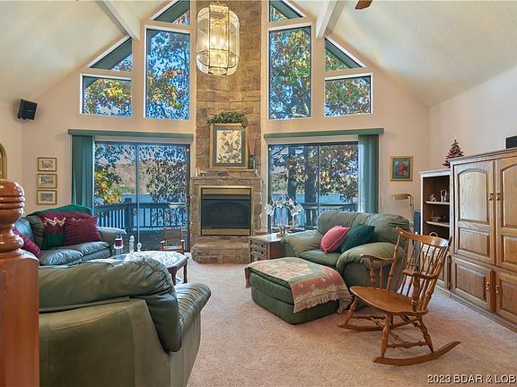 Perfect setting for this large home located on a beautiful part of Lake of the Ozarks. Large gentle lot with mature trees, over 140 ft of shoreline, deep water & even a private boat ramp all located at the 54 mile marker. With 4 bedrooms, 3.5 baths, 2 full kitchens and multiple living/dining areas this is a great floorplan for living the lake life! Large concrete driveway with plenty of parking cars, trailers, friends & family. There is even 6 garage spaces! Yes 2 in the attached garage and an additional detached garage with 2 spaces up and 2 down. What a great space for storage and or a workshop. Enjoy the best of both worlds with main channel views but located on the 54 mile marker so your not dealing with the same size boats as the other end of the lake. Talk about good fishing, this is the area! Home comes furnished per inventory and has a nice two well boat dock with lifts included in the price. This is a great package all located on a wonderful lot with endless possibilities. 4th bedroom is a great place for sleeping but has no window.