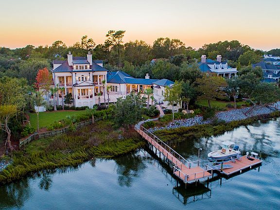 Elegant yet warm and inviting, this three-story deepwater home on Ralston Creek offers the best of Daniel Island Park living! Phenomenal views of the Wando River are eclipsed only by the attention to detail in this home such as copper roofing and gutters, black walnut floors, and an impressive floating staircase that extends three stories. Extraordinary craftsmanship sets this home apart, and water views from nearly every room leave an impression! An elevated, heated saltwater pool and outdoor living room overlook the marsh in a setup that is ideal for outdoor entertaining complete with fireplace, Sub-Zero fridge, sink, and Wolf grill. Enjoy boating with some of the most coveted water access on Daniel Island. This dock boasts a 6,000 lb boat lift, 30x10 ft floater, and water/power. The gourmet kitchen is a chef's dream and features luxurious details such as a copper farmhouse sink, dumb waiter, dual Sub-Zero refrigerators, and a Wolf range with double ovens. The main level master suite offers commanding views from its porch in addition to dual walk-in closets. The indulgent master bath features a spa tub, steam shower, towel warmer, and dual water closets. Every bedroom upstairs has a porch and private bath, and note the elevator for ease of access for guests. The third-floor flex space is perfect for billiards or to use as an informal den (complete with full bath and porch with long-range views of the Wando River). A detached guest house separated by breezeway could be used as a mother-in-law suite or home office. And you'll appreciate the low maintenance exterior of true stucco with copper roof and gutters. This spectacular estate is a must see in order to appreciate the unobstructed views of the Wando River, luxuries such as the wine room and full wet bar, the landscape design by Robert Chesnut, and details in the woodwork! Huge garage with room for 4 cars and plenty of storage/work space.