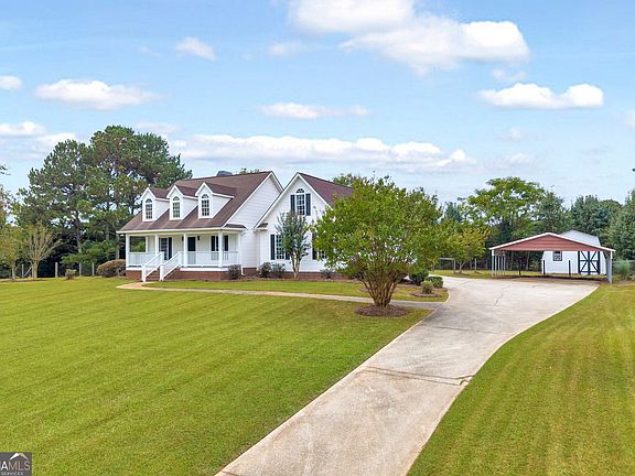 Experience the perfect blend of modern comfort and country charm in this beautifully remodeled home situated on 5 open, picturesque acres just 45 minutes south of Atlanta. From the inviting rocking chair front porch to the expansive back porch overlooking serene greenery, this property offers peaceful living with effortless access to nearby amenities. Step inside to discover a completely renovated interior featuring an open floorplan designed for both everyday living and entertaining. The breakfast nook, surrounded by large windows, fills the space with abundant natural light and frames stunning views of the backyard. The primary suite is conveniently located on the main level, tucked away on one side of the home for maximum privacy. Two additional bedrooms are located on the opposite wing, creating a comfortable split-bedroom layout. Upstairs, a versatile bonus room above the garage offers endless possibilities-ideal as a 4th bedroom, home office, gym, or entertainment space. Outside, the property's gorgeous curb appeal is complemented by a spacious storage shed, perfect for tools or hobbies. Enjoy the tranquility of rural living while being only 10 minutes from shopping, dining, and grocery options. This property offers the best of both worlds - peaceful living with modern style and convenience. Don't miss out on this opportunity.