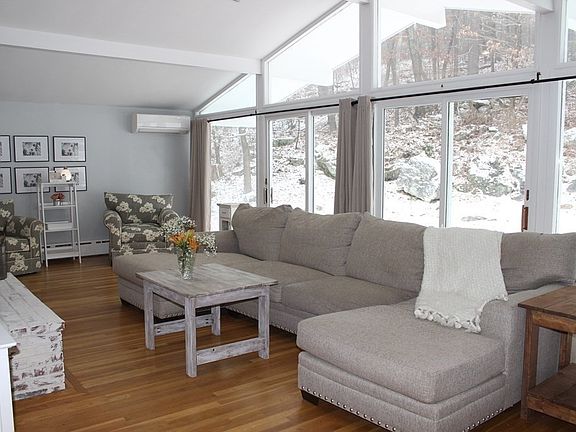 Spacious 3 bedroom, 2.5 bath ranch home on beautiful country road close to everything. Hardwoods and tiles throughout. Newer Appliances and gas heating system. Grand living area with back wall of windows overlooking private wooded lot. Cool off with a mini-split in the summer or warm next to 2 separate fireplaces in the winter.Large unfinished basement with fireplace waiting to be finished. Two car attached garage with plenty of parking. Town water and sewer all on over a 1/2 acre lot. A true opportunity.