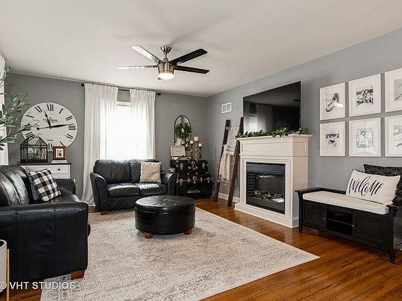 This 3+1 Bedroom/ 2 Bath Ranch has everything you are looking for. Exquisitely done Farmhouse Chic with Original Hardwood Floors, New lighting and built in Electric Fireplace. Open Concept Living is sure to please. Freshly painted throughout with accent walls featured in the Bedrooms and Kitchen. New 6 panel doors with new hardware, Wall and Floor Trim all-new. Bedrooms have Ceiling Fans. Closets have additional storage and the Master closet has a featured closet system. Completely renovated Main Bathroom with Granite counter top and Ceramic floors. Soaking tub with Ceramic subway tiles. Every room has a touch of something new. The Kitchen boasts stainless steel appliances, large ceramic tile floors, resurfaced cabinets, a new sink and faucet, an island, and recessed lights. Partially Finished Basement could be an inlaw suite (side door gives them their own entrance) with full Living/ Rec Room, Large Bedroom and Full Bathroom. The lower level Bathroom has brand new flooring and refinished cabinetry. The Laundry Room is so large in size the homeowners made a sewing/ craft nook and added extra storage. Did I mention storage? Additional storage room in the basement adds more storage space and is carpeted. House has Walk up Attic that could be finished to make a reading nook or teen hangout. Detached 2 1/2 car Garage has additional cabinetry and room to spare. Upgrades galore with this house from the Brand new Roof with Ridge Vent, Soffit, Fascia and Gutters. Newer sump pump and AC Compressor. The sought-after neighborhood is a gem in Elgin with close proximity to Wing Park for lots of outdoor activities including the Golf Course, Tennis, Basketball, Volleyball, Baseball and a Water Park. Do not Miss this one! You will be glad you came to visit Vincent Place.