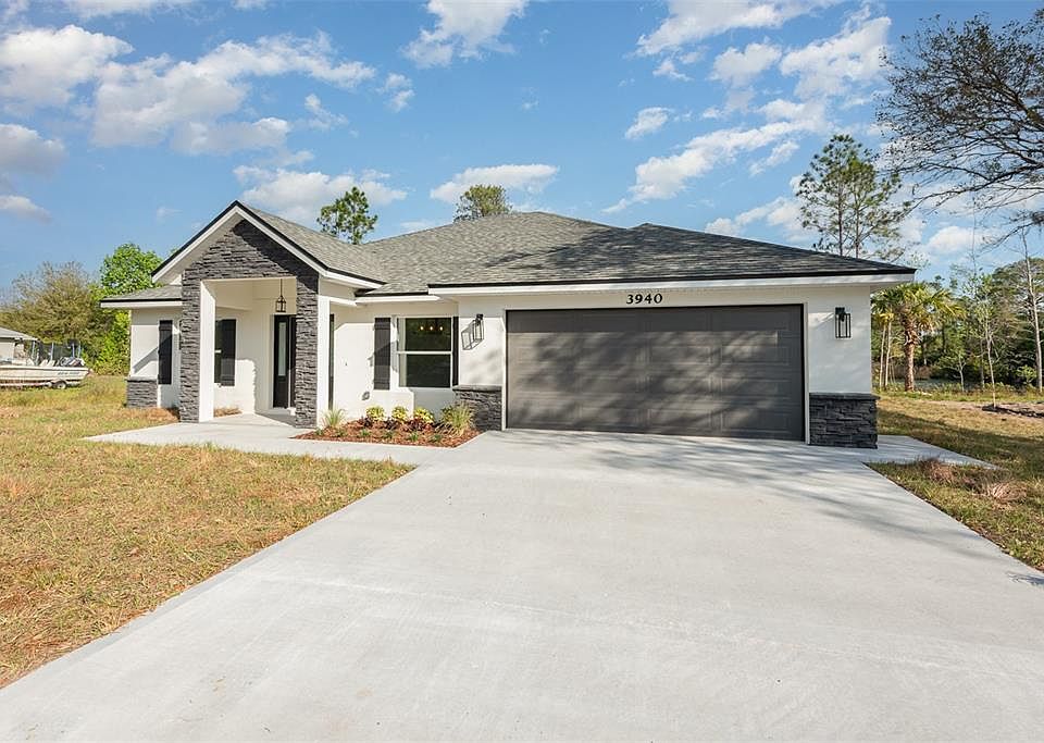 New construction 4/2/2 block home sits on an expansive .79-acre lot, overlooking a picturesque acre fishing pond. This residence offers an abundance of space and comfort. Step inside to discover exquisite tile flooring throughout & soaring vaulted ceilings. The heart of the home is the stunning kitchen, featuring 36'' white uppers with crown molding, SS appliances, a striking black island, quartz countertops, a breakfast bar, and ample pantry cabinets. Entertain with ease in the sprawling family room with French doors that lead out to the trussed-in back porch. Indulge in luxury in the master suite, complete with a tray ceiling, a lavish master bath featuring a walk-in tiled shower, garden tub, dual sink vanity, linen closet, and a spacious walk-in closet. Guest bath offers a large tub/shower combo, granite countertops, and another linen closet. Additional highlights include shiplap accents, upgraded light fixtures, tall baseboards, black Delta fixtures, stone finish, & impact glass. Experience the best of energy efficiency with low power bills and insurance premiums, making this home not only a sanctuary but also a wise investment. Right down the road from the Rails to Trails paved walking/ biking path that connects over 41,000 miles of trails Don't miss out on the opportunity to make this your forever home. Schedule your showing today and prepare to be captivated by all that this remarkable property has to offer.