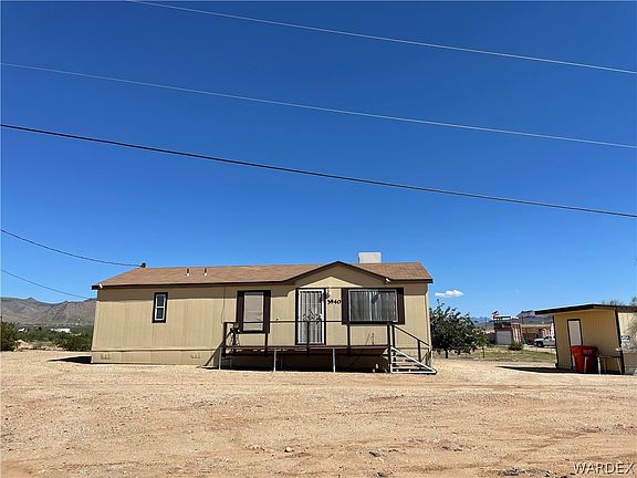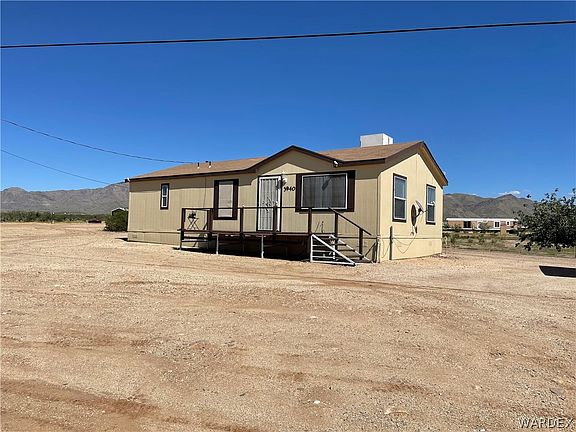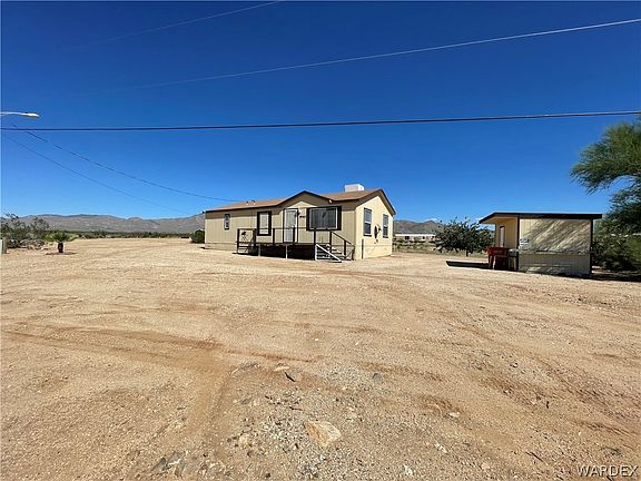 PRICE DROP!!!! Amazing views and tranquility are what await you in this 2007 Champion made, 2bd 2ba, DW MH; located in sunny Golden Valley, Arizona. Home has been well loved and cared for with all new paint throughout the home's interior and exterior. With 1,056 sqft of living space the open concept living area makes the home feel spacious and roomy. A casual dining area right off the kitchen. Kitchen has a propane stove and mulit leveled breakfast bar. All kitchen appliaces stay and the refrigerator is only 4 years old. Master suite features a walk-in closet and double doors lead you into the master bathroom with a linen closet and walk-in shower. Indoor laundry room with a built-in shelf unit. Enjoy the beautiful Arizona skies from the front deck. Property also has beautiful developing trees including mondell pines, a pistachio, a mulberry and many Tipu trees that grow very fast and tall for shade. Solar light pole that can be controled with a remote for mulitple settings. Owner has built a retaining wall to keep the water flow controlled and away from the home. Property has a utilty shed with lots of shelving. This is a must see property that is not far from BLM. Call today and set up your own private tour.