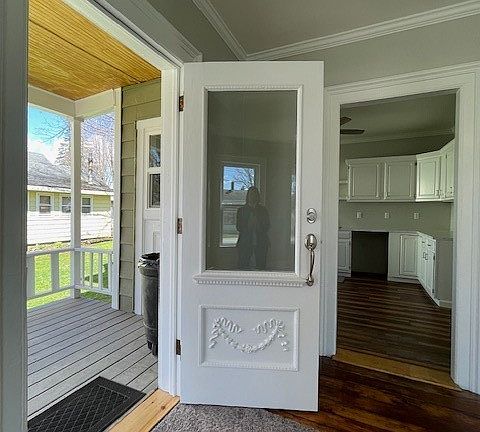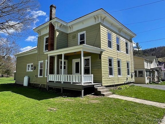 Great option for Investors or extended families-handsome renovated 2-family colonial. From the moment you open the front door, you just say "wow!" All the old-house charm is there, but better! Open(ish) floor plan w/tall(new) windows & ceilings featuring crown molding & deep baseboards, pretty wood floors & a functional layout. You'll find a living/dining room upon entrance w/an updated & bright kitchen off the the left. A first floor laundry room and new full bath complete the main house 1st floor. The 2nd fl landing is large enough to be used as a play space or studio w/a powder room in the corner. Three sunny bedrooms w/all new carpeting & electric baseboard heat, round out this level.The 2nd, smaller unit is accessed @ the back of the house w/ w/2 bedrooms up (each w/new carpet & heating& an updated full bath, "kitchen"& living area on the main floor. Walk past the oversized 2-car gar to the big back yard that ends @ Otselic Creek. Located close to Muller Hill State Lands. NYSEG electric & public H20. Sold in as-is condition. House is in Flood Plain