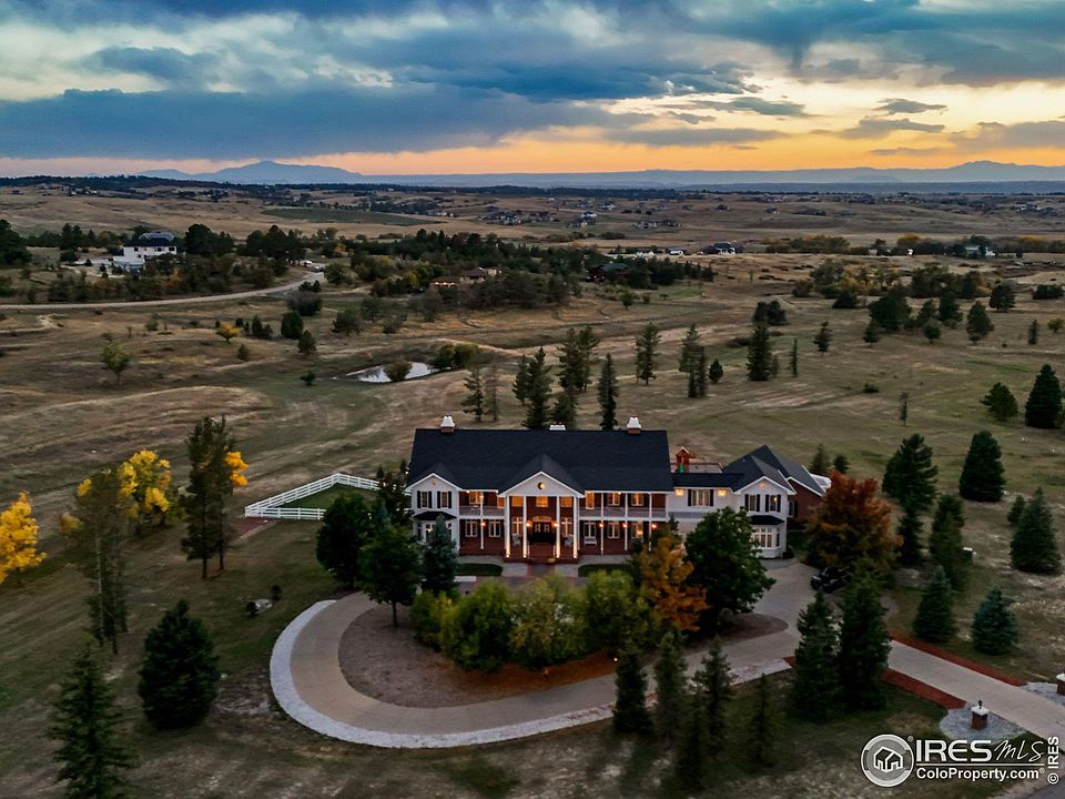 Step into a world of unparalleled luxury and serenity at this breathtaking estate on nearly 10 acres of unspoiled land. Offering sweeping, unobstructed views, this private retreat combines countryside tranquility with easy access to Denver, Parker, and Castle Rock. It's more than a home-it's a lifestyle. From the moment you enter the grand marble foyer with its dual curved staircases, this 7-bedroom, 9-bathroom masterpiece makes a commanding impression. The great room features soaring 20+ foot ceilings, walls of windows, quartz topped wet bar for those special cocktails and French doors opening to a spacious deck, perfect for enjoying stunning sunsets. The recently renovated gourmet kitchen is every chef's dream, with Viking appliances, a sprawling quartz island, and a butler's pantry. The walk-out dining area becomes the heart of the home-a place to gather and create memories. The luxurious 2nd-floor primary suite is a peaceful retreat with a cozy sitting area, fireplace, private balcony, and a spa-like bath with marble countertops. For work and play, the wood-paneled office offers custom built-ins and a fireplace. The fully finished basement delivers the ultimate entertainment experience with a home theater, billiards area, wet bar, and even a second kitchen. Host movie nights or large gatherings with ease. The attached guest cottage with a private balcony is perfect for visitors or in-laws. Six of the seven additional bedrooms each offer ensuite baths, ensuring comfort and privacy. Outside, enjoy the 40'x40' play area, motor courtyard, and circular driveway. Zoned for horses, this property is perfect for equestrian enthusiasts. With over 2,000 sq. ft. of balcony and patio space, you'll have the perfect vantage point for breathtaking views. This one-of-a-kind residence offers an extraordinary living experience. Schedule your private showing today!