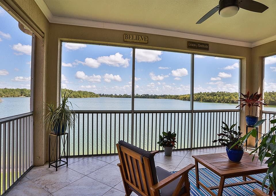 Spectacular waterfront condo located in the desirable gated community of Carillon Lakes. This upstairs three bedroom ,two bath, two car garage home has been meticulously remodeled from floor to ceiling. Upon entering through the front door, you are immediately greeted with water views, vaulted ceilings, hardwood floors, crown molding, and so much more. Flowing from the great room is the renovated kitchen; quartz countertops gleam, pristine white wood cabinets with substantial hardware, stainless steel appliances, porcelain farm sink, and again more water views from the breakfast nook. Off the great room you can also access the screened in porch that enjoys amazing water views, custom ceiling fan, and large porcelain floor tiles. The master bedroom enjoys its own private access to this covered screened in porch. The master bedroom has vaulted ceilings, a large picture window to enjoy the water views and an abundance of closet space. The en-suite master bathroom makes you feel as if youve just arrived at your own private spa. The bathroom boasts Quartz countertops with dual vanity, Italian porcelain tile throughout, a private water closet and a walk-in shower with two shower heads and custom shower door. The condo offers a split bedroom floor plan. The other two bedrooms are both spacious, bright and both enjoy a large walk-in closet each. Both bedrooms share an updated guest bath with Italian porcelain floor tiles, granite countertop vanity and updated light fixtures. The laundry room has also been updated for your convenience, with extra wood cabinetry, porcelain floor tiles, and laundry sink. The Carillon Lakes community offers a 24 hour guard gate, clubhouse, tennis courts, pickle ball courts, junior Olympic size pool, playground and so much more. Make your appointment today!
