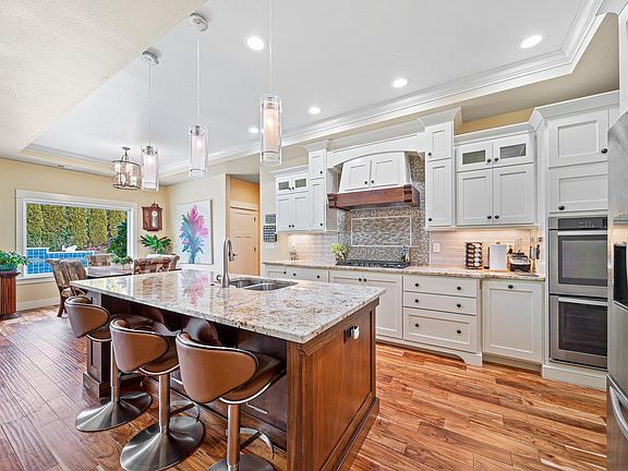 Gorgeous, contemporary home nestled in one of East Medford's most desirable neighborhoods! Single level 4 bed, 3 bath w/a convenient split bedroom floorplan, beautiful upgrades & amenities including detailed ceiling treatments throughout, designer lighting, & 2 lg storage closets w/built-in shelving. Striking entryway w/designer chandelier & 2 built-in alcoves. Large living area w/vaulted beamed ceilings, hardwood floors, built-in media space, gas fireplace w/mantle & beautiful tile surround. Gourmet kitchen, open to the living & dining areas featuring a large center island w/eating bar, granite countertops, intricate tile backsplash, ss appliances, & double ovens. Luxurious primary suite w/private patio access, dual sink vanity, walk-in closet, & huge walk-in tile shower. Fabulous laundry room w/built-in cabinetry, workspace, & utility sink. Wonderful outdoor living area w/a large, covered patio, fantastic in-ground pool w/a tiled retaining wall, & easy care, mature landscaping.