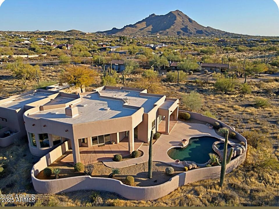 Tranquility awaits at this casual, custom Southwest estate. Situated on over 3 acres of gently rolling hills amid STUNNING 360° MOUNTAIN VIEWS, this home offers a main house with 2 bedrooms and an office plus a separate guest casita. The open floor plan has well defined eating and living areas without obstructing the phenomenal views from every room, in every direction. The pebble-finish pool and rock waterfall feature beckon you out to enjoy the peaceful sunsets, panoramic mountains and spectacular evening skies. The walk-in pantry and oversized laundry room are conveniently located off the kitchen, coming in from the spacious 3 car garage. Close to everything wonderful about Cave Creek, the home was strategically positioned well away from the street while still leaving ample room for an an equestrian enthusiast to add a horse set-up. When you visit this home, you will truly feel the majesty of its location.