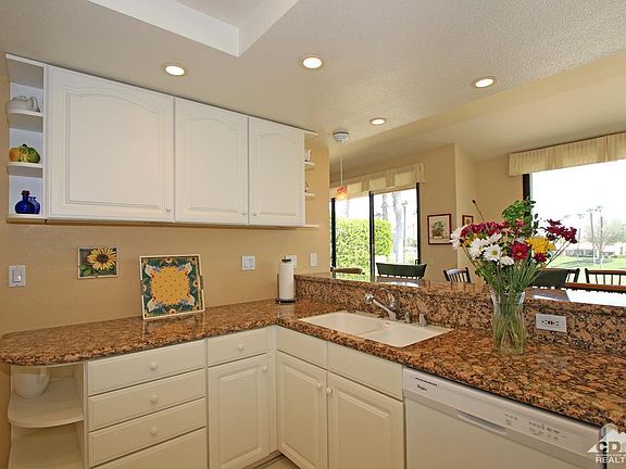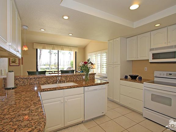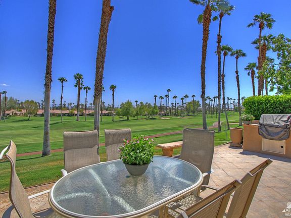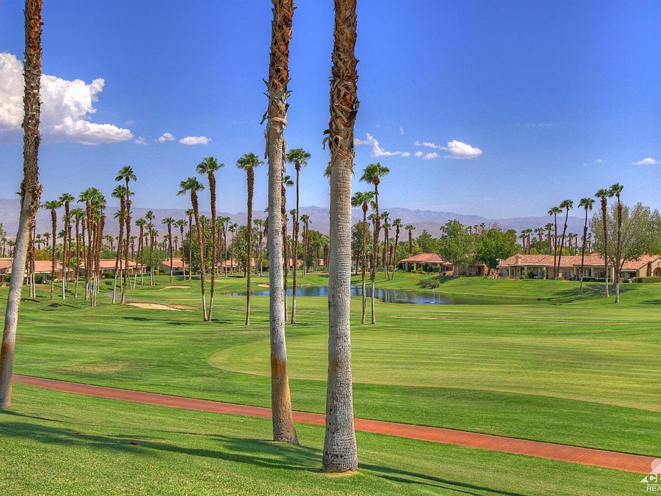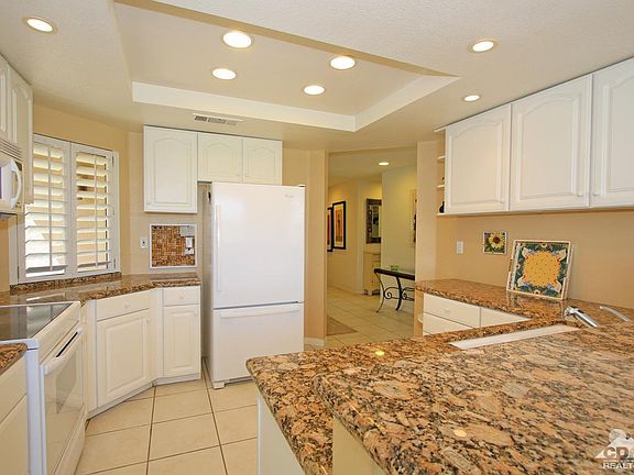 Situated high on an elevated lot overlooking 4th & 8th fairways on the Championship Golf Course. One of the nicest panoramic views in Palm Valley C.C. Golf course patio is east facing with Lake, Mountain and double wide fairway views. End unit, 3 Bedroom 2 Bath this lovely Condo has had many upgrades. Some of the newer features are windows, mirrors removed in living room, remodeled Kitchen w/granite slab counter tops. Buffet/cabinets in dining room, canned lighting. Extended tiled patio with custom BBQ area. Finished garage w/newer opener. Golf cart has new upholstery, just to name a few. Furnished per inventory & a list of upgrades available. Fabulous location, great street!
