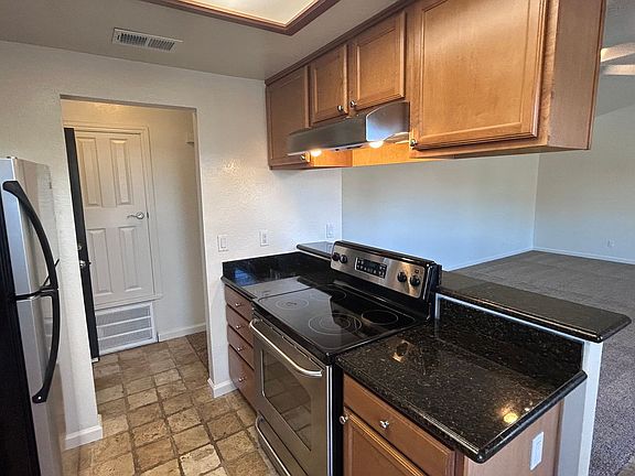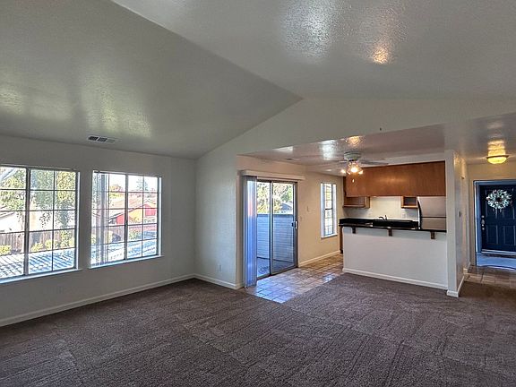 This upstairs condo has approximately 1,000 square feet, with a living room, vaulted ceilings, NEW carpet and tile flooring throughout, blinds, Corian countertops, electric range, dishwasher, fridge(no warranty/repair), garbage disposal, central heating & air conditioning, washer/dryer(no warranty/repair), ceiling fan, one covered carport, balcony. Close to schools, parks, and shopping. Take Golden State Hwy off on Standiford Ave, left on Dale Rd. No Pets.