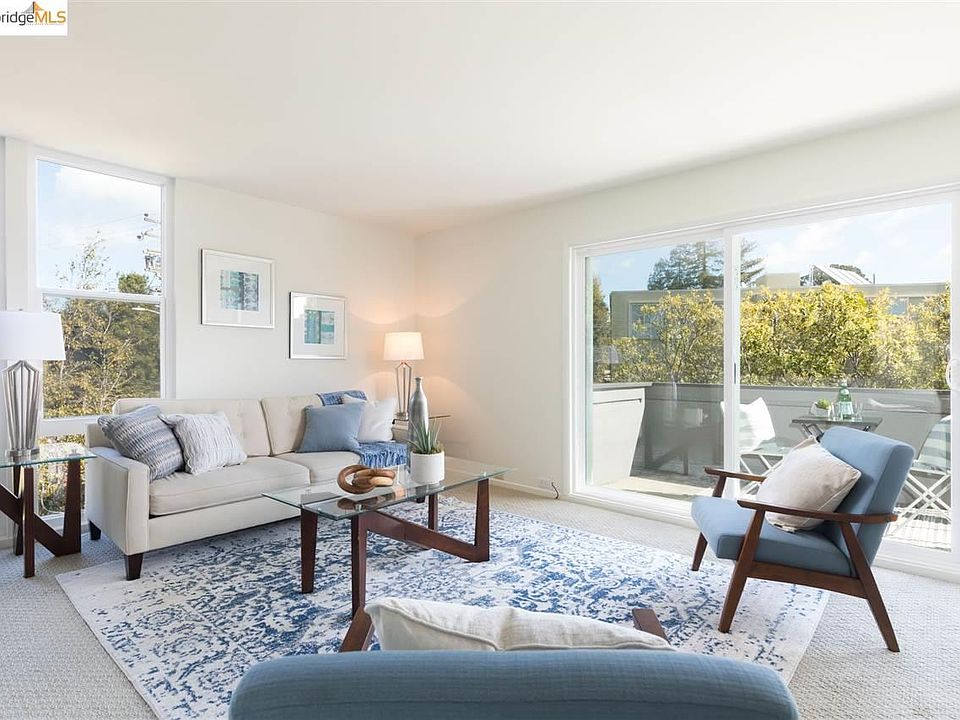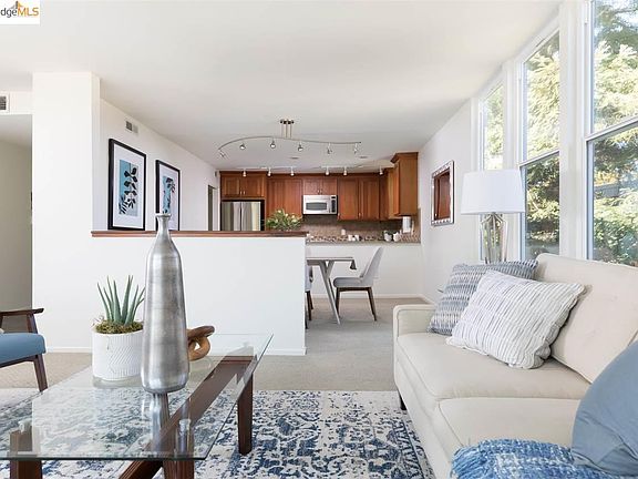 This top-floor condo feels like a treehouse soaked in sunlight, a wonderful two bedroom, two bath corner end unit with windows on three sides. It is perfectly nestled between two of Oakland's most popular business districts-Piedmont Avenue & Grand Lake. The spacious floor plan allows for incredible privacy with a long hallway between the bedrooms & main living space. Bask in the warm glow of the morning sun or enjoy an afternoon tea on the private balcony with views of the Oakland hills. With an open living/dining room, floor-to-ceiling windows in the living room, glass sliding doors to balcony, the air flow and light give a sense of bringing the outdoors in. Freshly-painted, dual-pane windows, newer carpet, newer refrigerator, three large mirror closets and two skylights are just a few features. This unit comes with a deeded spot in the gated parking garage and electric charger for your personal use. The building offers a shared guest parking spot and elevator to whisk you home.