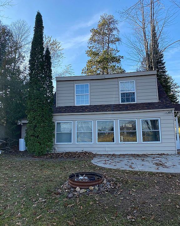Wixom Lake waterfront cottage or home. Open concept with nice view from windows on the waterside. Two bedrooms on the upper level with half bath. Full bathroom on main level. Range, refrigerator, microwave and stackable washer & dryer included. Two docks and two sheds included. Updates include well in 2000, electric updated in 2019 with RV hook up, hooked to city sewer in 2008, new shingles in 2015, concrete patio and fire pit in 2016, carpet on stairs 2016. Ceramic in bathtub within past five years, New hot water tank 2019, New laminate flooring upstairs 2019. Natural gas wall furnace. Walking distance to the gas station, dollar store and hardware store. Close to boat launch. Short drive to market. There is a gated park lot property owners can pay for by the year with beach area and basketball hoop. Plenty of land space to build a garage. Near thousands of acres of state land. Move in condition, immediate occupancy. Beautiful yard with fence on the south side and row of trees on the north side.