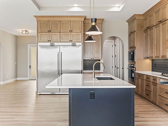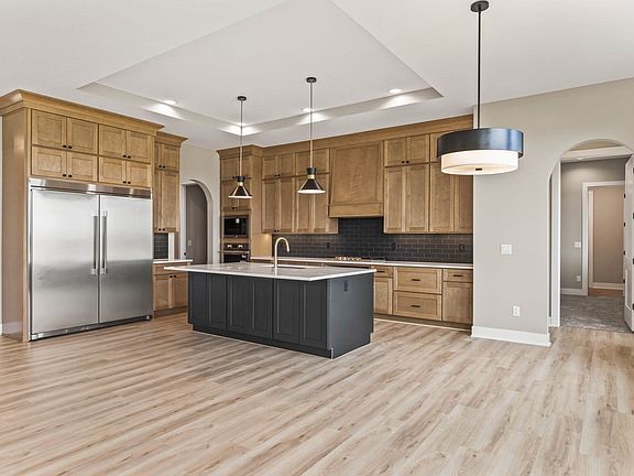 Welcome to your dream farmhouse. Where craftsmanship meets comfort in every detail. Step inside and feel the warmth of 10-foot ceilings and open-concept living filled with natural light. The kitchen is the heart of the home, showcasing cabinets to the ceiling, a massive island with storage on both sides, and professional-grade stainless appliances, including an oversized side-by-side fridge and freezer, and a gas cooktop with a custom hood. The living room invites you to gather around the sleek black fireplace framed by stunning windows and soft-toned LVP flooring with rich wood trim accents.