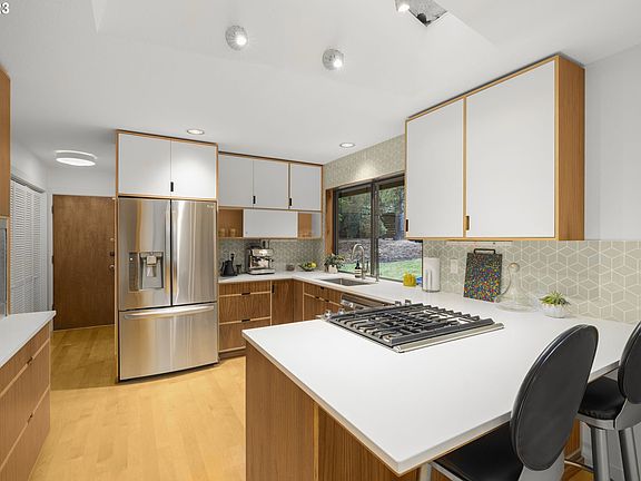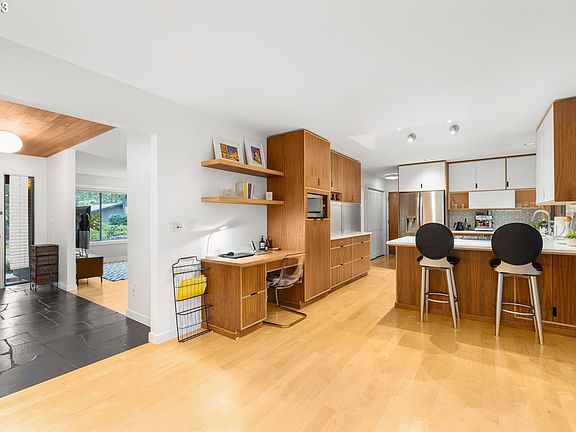 Stylish Mid Century single-level home perfectly perched one block from top-rated Bridlemile Elementary and the sprawling Hamilton park. This attractive home blends style with comfort and is loaded with updates including a completely remodeled interior with a gorgeous new kitchen with designer tile, stunning custom cabinetry and high-end appliances, a dreamy primary en suite bath, a new furnace and A/C, new metal roof and garage doors, and a new deck and irrigation system. Rare opportunity to live in this fantastic pocket of homes where great schools, parks, and sunset architectural strolls are right outside your front door. [Home Energy Score = 1. HES Report at https://rpt.greenbuildingregistry.com/hes/OR10218909]
