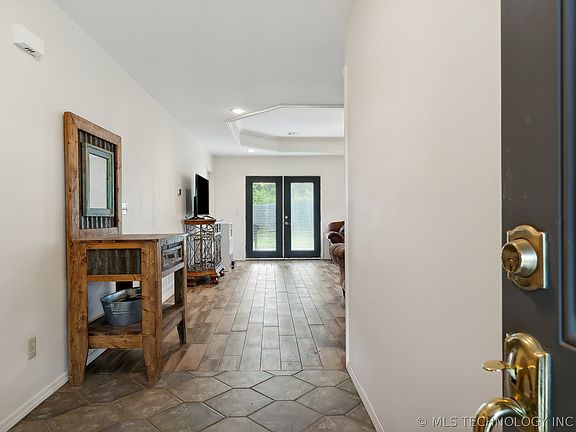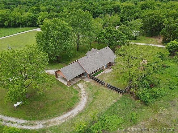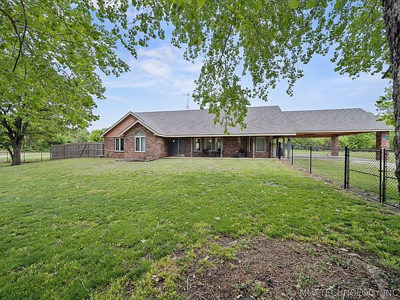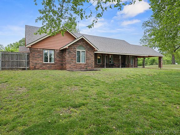 Brick home on 2 acres m/l just south of Bartlesville off Gap Road. The home has a wonderful covered front porch and covered parking area on the east side of the home. The living area is open to dining, fireplace, split bedroom plan. Master bed has a master bath with separate walk-in shower. Front and back yard are fenced. The setting is peaceful with wonderful mature trees.