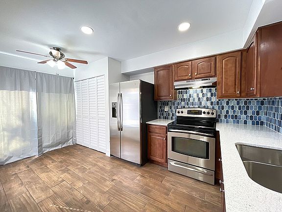 Come rent and live in this completely renovated 2/2 single-story townhome with a private fenced front paver deck and luxurious master bathroom. This residence includes wood look tile flooring throughout the entire house, new kitchen cabinets with beautiful quartz countertops, vibrant backsplash, stainless steel appliances, and a washer/dryer. Recessed lights throughout the kitchen, living room and master bedroom give more than ample lighting throughout the home. French doors lead to a huge master bedroom with sliding glass doors leading to the backyard and patio. This master bedroom also features a large walk-in closet with a built-in dresser, including quartz countertops and a second sink. The luxurious master bathroom has an oversized shower tiled with large format marble-look porcelain, a rainfall shower-head, a soap niche, and a frameless glass wall, along with a 36" vanity and marble countertop. The second bedroom has a walk-in closet, along with access to the second bathroom. The second bathroom also features the same marble look porcelain tile and a quartz countertop vanity, as well as plenty of storage. This townhouse has large closets throughout the floor-plan and an outdoor shed for additional storage. (3) camera security system, and hurricane panels for all windows. The landlord loves this property and it shows! See it to believe it! This home is close to downtown Davie, College Ave, including Nova Southeastern University, Florida Atlantic University, McFatter Tech, and Broward College. HCA University Hospital 5 min away. The Turnpike is 5 min away and I-595 is about 8-10 min away. Very central to all locations in Broward. * Available for showings starting August 19th.* - Renter pays for all utilities (water, electric, cable/internet) - No Smoking - (1) Well behaved pet allowed (Under 60 lbs) *$300 non-refundable pet fee* - Two assigned parking spaced - Maximum of (2) Vehicles allowed (no exceptions) - First, Last, Security deposit (equal to one month) to Move-In - Income requirements and Credit Score of 600 min. - Renters Insurance Policy Required (100k policy) - Tenant Responsible for Application Fee of $40 which includes National Criminal Report, Full Credit report and HOA Application fee of $150 per person or married couple.