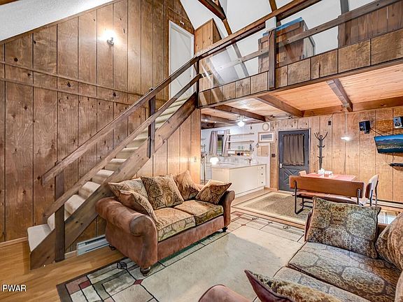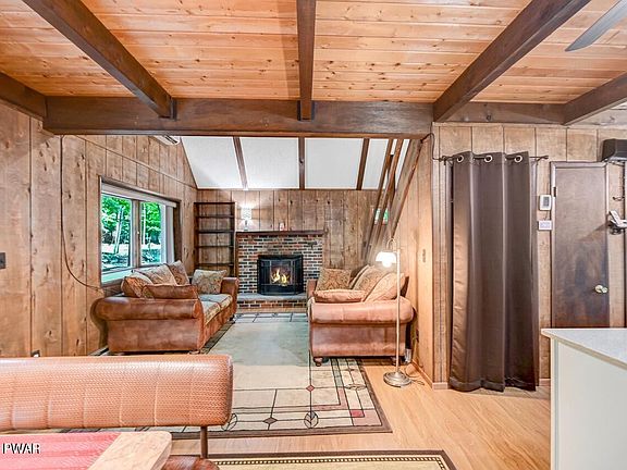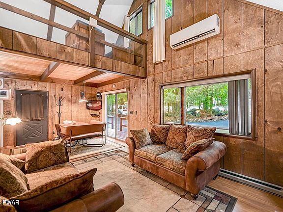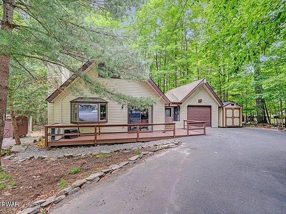 Discover a captivating chalet home set amidst a wooded oasis in an amenity filled community in The Northern Poconos, just two hours from NYC, NJ, and Philly.  With its paved driveway and step-free entry, accessibility is effortless. The front deck beckons you to unwind and embrace the serene surroundings. A breezeway seamlessly connects the main house to a screened-in area, an idyllic spot for enjoying the outdoors.  Inside, rustic charm merges flawlessly with modern touches. The main living area boasts high ceilings, creating an airy and spacious ambiance. A focal point is the brick fireplace with a propane insert, radiating warmth and charm. Experience year-round comfort with the split unit A/C and heating system.  Storage is plentiful, with a garage, storage area, and a new shed., Beds Description: 1 BED 2nd, Beds Description: 1Bed1st, Beds Description: 1 BED 2nd, Baths: 1 Bath Level 1,  Eating Area: Dining Area