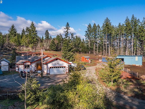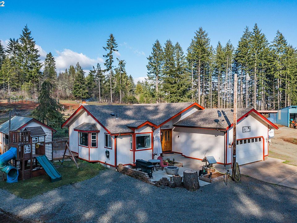 Very private home on 5 acres just a few minutes North of Marcola. Single level home feature vaulted ceilings, skylights, spacious open concept, laundry room, high speed internet & fireplace. Large primary bedroom w/ walkin closet & master bath, French doors to large deck, indoor laundry and generator hook up. Two open stalls, horse corral, goat shed, new chicken coop, hay storage, pastures, x-fenced, lots of horse, ATV's and hiking trails close by. Large deck and patio, covered dog run.