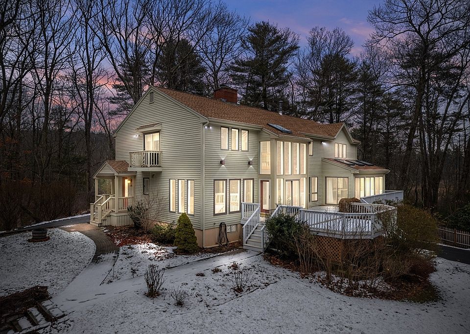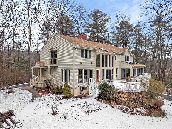 Welcome Home! Sitting pretty on a tranquil, private six-acre wooded lot, this large contemporary is a calming sanctuary. Down the long driveway is an oasis that includes gardens, a pergola, a wraparound deck and a small pond. A wide kitchen with hardwood floors, an island, granite countertops, and ample storage leads to a sun-filled eating area surrounded by floor-to-ceiling windows. An open dining/living room with a fireplace and built-in shelving centers the home around family gatherings and entertaining. Walk through to an expansive family room with a cozy pellet stove, that leads to a separate sunroom with a higher ceiling and bright skylights. Not to mention the two-floor entryway/additional sunroom leading out to the deck. Upstairs you'll find the large main suite with a full bath and three other sizable bedrooms with another full bath. Improvements include a newly paved driveway, a new 400-gallon oil tank, a generator, and new fencing. Easy to show.