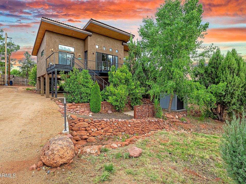 Two upstairs primary suites open to a view deck with custom metal railing, marine cabling, and Trex flooring, perfect for sunrise coffee or sunset wine. The open-concept great room stuns with vaulted ceilings, walls of glass, quartz counters, Euro-style cabinetry, LED lighting, and low-maintenance luxury plank floors. Downstairs offers a flexible third bedroom/living space with full bath, refrigerator and microwave. The finishes reflect the upper level. Front insulated glass doors lead to a meditation patio with beautiful garden. Oversized carport offers an EV charging station. Extra parking is great for guests or RV. Other features include outdoor pavers and landscaped grounds with shrubs on a drip system, storage shed, 20-gauge steel roof, electric 22 seer high efficiency-mini split heating & air conditioning with five station controls. The abundant wildlife is free of charge. If you're looking for a Sedona getaway, full-time residence or investment property, don't miss out on this low-maintenance gem.