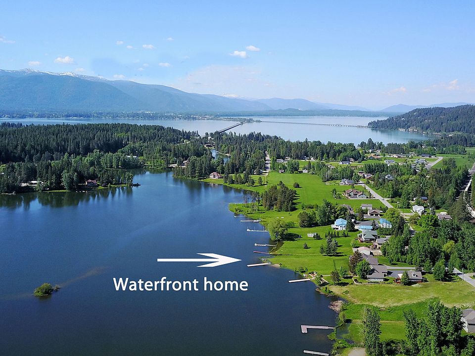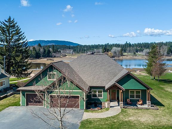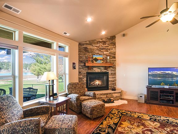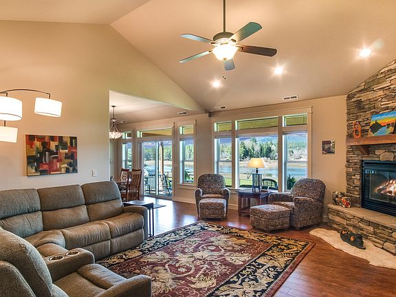 Waterfront home with 120 ft of level shoreline, new dock, sandy beach & 2 acres! Fabulous water views from this single level home with inviting open floor plan, expansive windows & floor to ceiling rock accented wood burning fireplace. Nice kitchen design with granite counters, tile back splash, custom cabinets, SS appliances & opens to the dining room. Luxurious master suite w/patio access, water views, spacious walk-in closet, private bathroom w/granite counters, dbl sinks, linen closet, walk-in tiled shower & soaking tub. Lovingly maintained 4 bedrooms, 2.5 baths, living room/music room, attached 3-car finished garage w/staircase to a 464sf storage room. Built in 2013, central forced-air & AC. Entertainer's delight; private setting, professionally landscaped with sprinkler system,