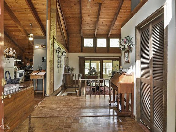 Rustic, private log home located on 5 wooded acres close to Turin, Senoia, Sharpsburg! Enjoy this peaceful serene 5 acres of bliss in a well built log home with lots of space awaiting your personal touches! Downstairs (Terrace) area boasts addl master bedroom area, laundry area, oversized bath, den, office space, additional bath, addl bedroom and walk out into fenced back yard. Main level holds sunken family room, sunroom, open country kitchen, bay breakfast room, oversized mud room and 2 bedrooms! Vaults and exposed beams, pine walls and floors! Make this wonderful home your own! Lots of closets and storage space!