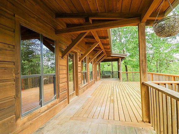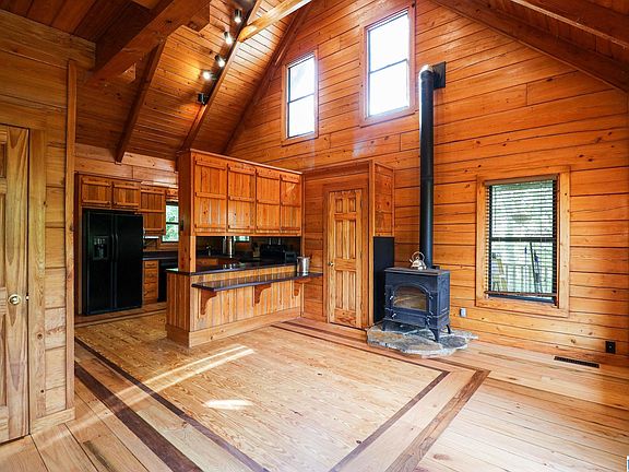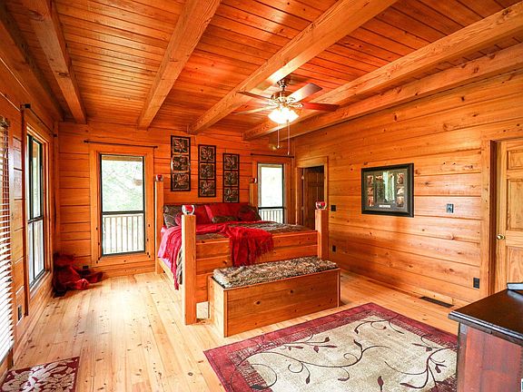 A truly stunning log cabin with amazing features and a picturesque setting. The use of cypress wood floors and large windows that offer panoramic views of the surrounding landscape create an inviting and nature-inspired atmosphere. The master suite with its spacious layout and oversized walk-in closet provides comfort and convenience. The loft, which can serve as both a bedroom and an office space, adds flexibility to the cabin's layout and functionality. This area seems like it would be a great retreat for relaxation or productivity, depending on your needs. The lower levels of the cabin offer even more possibilities. The large living room/den that functions as a theater room provides an entertainment hub for family and guests. The basement bedroom with an en suite adds extra accommodations, and the presence of a kitchenette with separate exterior access makes it an ideal option for a mother-in-law suite or a space for a college student, ensuring both privacy and convenience.