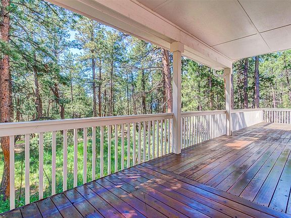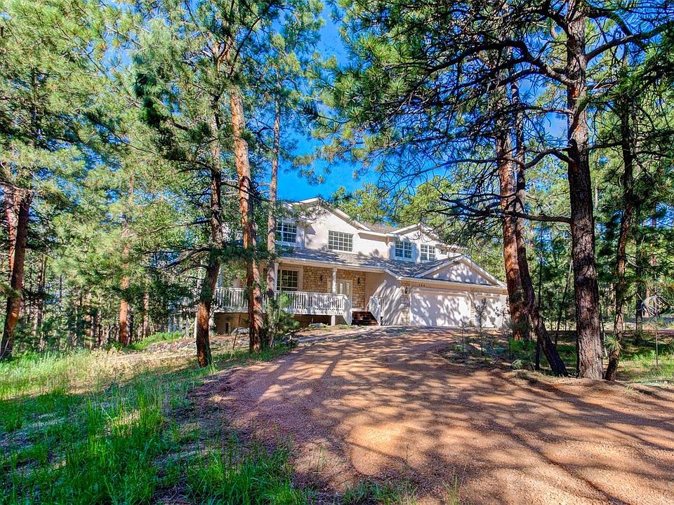 Absolutely exquisite and private 6-bedroom home nestled on 2.8 park-like acres of towering Ponderosa Pines, offering a beautifully designed open floor plan, walls of windows framing serene forests from every room, elegant curved staircase, multiple living and dining areas, two warm fireplaces, gracious open kitchen with island, newly refinished hardwood floors, arched doorways, luxurious master retreat with a spa-like bath, expansive walk-out lower level, oversized 3-car garage, Comcast/Xfinity service, natural landscaping with abundant wildlife, and a tremendous wrap-around deck overlooking magnificent views and soaked in sunlight from sunrise to sunset! Uniquely flexible with no HOA or covenants and convenient to Colorado Springs, Denver, and D-38 schools, this beautiful move-in ready home offers spectacular indoor and outdoor living space and is not to be missed!