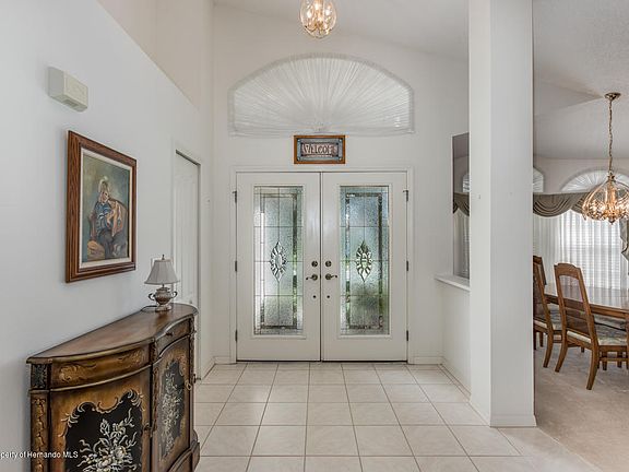 Located in Hernando County Florida this home is situated in the beautiful upscale 55PLUS gated community Wellington at Seven Hills. Double door access leads you into one of the most popular models within this community of 1100+ properties. You are greeted by a formal dining room adorned with bay windows to the left. Straight ahead the vaulted ceiling Livingroom, with double pocket doors to the right lead to a den/guest bedroom. The full guest bath with Formica countertop, separates the two guest bedrooms. Across the living room you will pass the sliders of the screened lanai on your right with a view on your left of the open floor plan as you enter the master bedroom (this easily accommodates king size furniture) once again there are vaulted ceilings as well as a walk in and a reach in closet that flank the hall entry to the master bath. Dual sinks, cultured marble countertops, easy access snail shower (no door nor shower curtains). As you leave the master bedroom into the Livingroom you can see through the room to the breakfast bar open to the kitchen, enjoy chatting with family and friends while preparing snacks or meals, counter tops Formica. Spacious eat in area, pantry, also access to separate laundry room (with sink & cabinet), and garage. The screened lanai gives you that perfect setting to read a book, enjoy that end of day glass of wine and more. 24/7Guard, Bar & Grill with friendly staff & delicious dining overlooking heated pool & spa. On-site fitness, billiards, tennis, bocce, library, & more. Please wear masks.