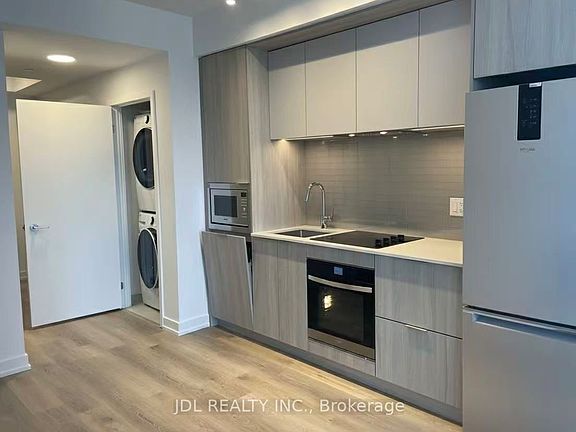 Brand-new, never-lived-in 1 Bed suite in the new Square One District by Daniels , featuring approx. 9 ft smooth ceilings, laminate flooring, contemporary baseboards/casings, mirrored closet doors. The modern kitchen includes custom cabinetry with under-cabinet lighting, quartz countertops, tile backsplash, soft-close hardware, and a full set of European-style 24" appliances. The bathroom offers an integrated vanity, floor-to-ceiling tile, and glass shower. Additional highlights include a stacked front-loading washer/dryer, individual hydro metering, Decora switches, and pre-wired cable/internet. Exceptional amenities include a 24-hour concierge, fitness centre with half-court basketball and climbing wall, co-working lounge, kids' play areas, garden plots, and a terrace lounge. Steps to Square One, Sheridan College, cafes, parks, and transit, with quick access to 403/401/407, MiWay, GO Transit, and the future Hurontario LRT.
