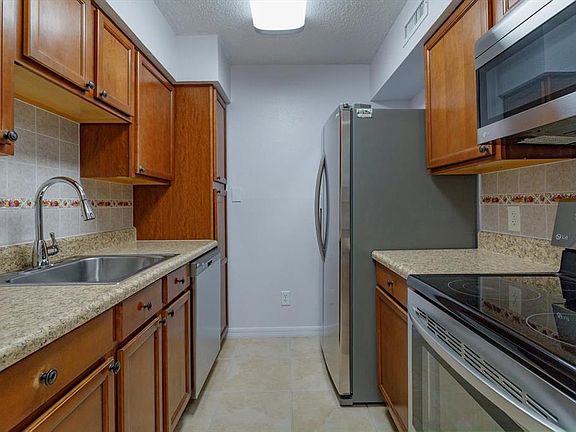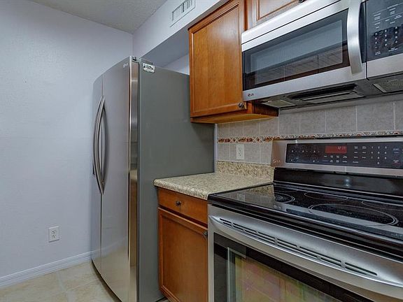 Stainless steel appliancesTiled backsplashWood cabinetry