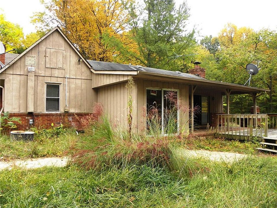 Brown County Estate Sale. Property w 5 acres with open & wooded areas.Pond next door is not owners. Home appears to need exterior updates such as paint, chimney, some siding. Interior needs cleaned & appears to be move in ready. The floor plan offers a cute bungalow w/wood & tile floors & beautiful wood doors. Living Rm has a wood insert in the brick fireplace & cathedral ceilings. Dining has wood floors just off the Living Rm. Kitchen has tile counter tops & floor. Master Bdrm is carpeted w/cathedral ceiling & large closets w/above storage. Second bedroom is carpeted with closet. Laundry room has brick floors & leads out to patio.Covered porch front & back. Rear deck has a brick grill. 24X48 Garage/Barn. Estate sale in "AS IS" condition.