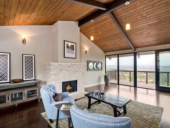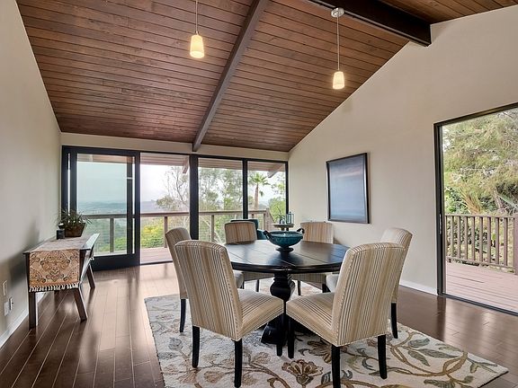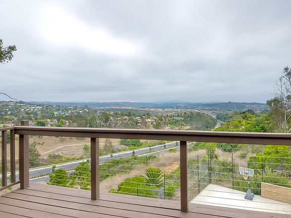 A MUST SEE, Olde Carlsbad, custom, contemporary estate with amazing panoramic views and sunrises. Nestled at the end of a quiet cul-de-sac you will enjoy the privacy and many outdoor patios and decks to entertain and relax. This special home is surrounded by trees which gives the feeling of being in your very own modern tree house with vaulted ceilings and oversized windows. Updated kitchen, bathrooms and windows, hardwood flooring throughout with carpeting in the bedrooms. The back yard has a basket ball court and large grass area. Almost 3/4 of an acre, this lot provides room for many possibilities. No HOA or Mello Roos. Buyer to verify square footage, room dimensions, lot size, boundary, City zoning and use, school district and information from MLS prior to submitting offer.