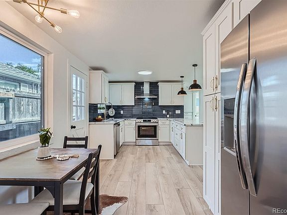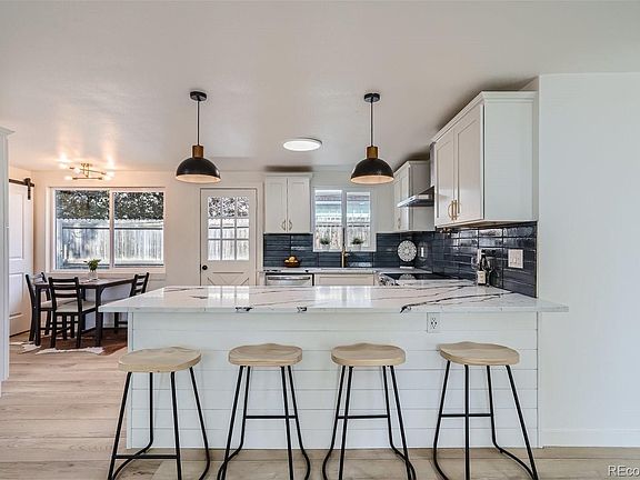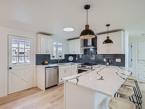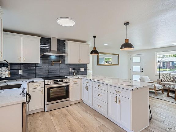 This remarkable property is truly one of a kind! Professionally designed, 100% beautifully remodeled 3 bed, 2 full bath Wheat Ridge ranch. On a huge corner lot on a quiet street walking distance to 38th ave and 44th shops, Tennyson, Sloans Lake, breweries, coffee houses restaurants, the location can't be beat. The open concept main level has all new hardwood flooring throughout. The gourmet Chef's kitchen features all new cabinets, new quartz countertops, custom backsplash with pot filler, high-end stainless-steel appliances, range hood and custom pantry with built-in microwave. The entire interior has all new drywall/texture and new paint throughout. The primary suite features a large bath with custom shower with bench and walk-in closet. The home was remodeled to new BUILT GREEN standards not relying on any natural gas and has zero carbon emissions. Add solar panels and the house will run itself for free. There is a new sewer line, all new insulation, new LOW E windows, new energy efficient LED light fixtures. There is a brand new multi zone minisplit heat pump system for super high efficiency heating and air conditioning. The exterior is equally amazing with covered front porch with ring video doorbell and newly fenced yard, detached oversized 2 car garage with new smart WIFI enabled opener and level 2 240v EV charger. Sewer line repairs recently completed.